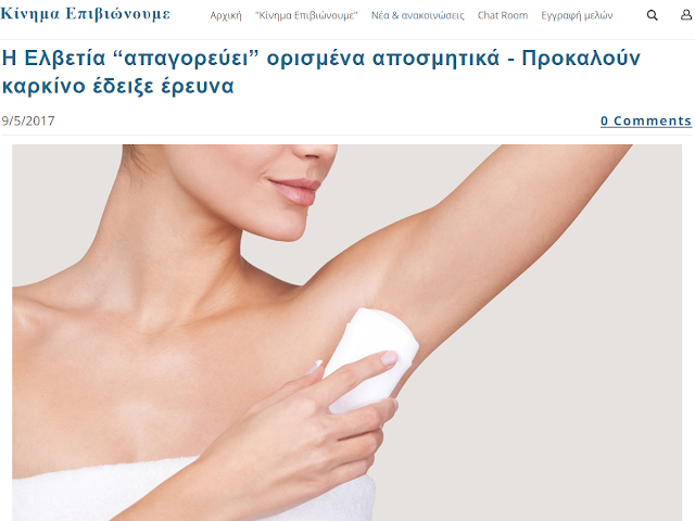 Οι Ελβετοί ανησυχούν για το ρόλο που μπορούν να διαδραματίσουν τα αποσμητικά στον καρκίνο του μαστού -και συγκεκριμένα τα άλατα αλουμινίου στα αντιιδρωτικά- και παίρνουν μέτρα για να κάνουν κάτι γι’ αυτό.