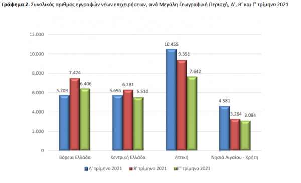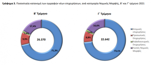 Οι εγγραφές νέων επιχειρήσεων (ενάρξεις λειτουργίας επιχειρήσεων), για το σύνολο των τομέων της οικονομίας, το Γ’ τρίμηνο 2021 ανήλθαν σε 22.642, παρουσιάζοντας αύξηση 9,2% σε σχέση με το Γ’ τρίμηνο 2020 που είχαν ανέλθει σε 20.725 και μείωση 14,1% σε σχέση με το Β’ τρίμηνο 2021 που είχαν ανέλθει σε 26.370.