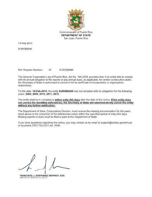 Το πρώτο έγγραφο εδώ είναι από το Υπουργείο Εξωτερικών της Κοινοπολιτείας του Πουέρτο Ρίκο. Το Υπουργείο Εξωτερικών της Κοινοπολιτείας του Πουέρτο Ρίκο ζητά από την Eurobank να συμμορφωθεί με τα πρότυπα του Γενικού Εταιρικού Δίκαιου του Πουέρτο Ρίκο. Αυτό το έγγραφον συντάχθηκε στις 14 Φεβ. του 2014.