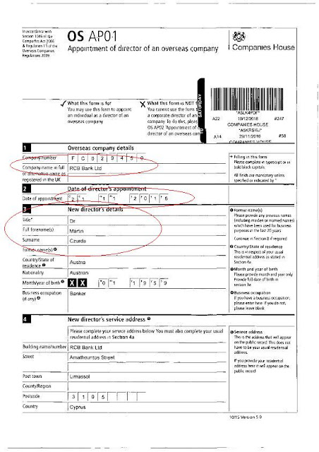 Επίσης η εν λόγω τράπεζα έχει γραφεία και στην Αγγλία όπου σύμφωνα με το κάτωθι έγγραφο και με ημερομηνία 21/11/2016 μας ενημερώνει για τον διορισμό του εν λόγω κυρίου στην θυγατρική της .