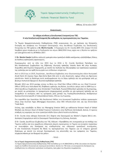 Με σχετικό δελτίο τύπου που εξέδωσε το ΤΧΣ μας ενημερώνει κατόπιν αποφάσεως του αρμοδίου υπουργού οικονομικών για τον διορισμό του νέου διευθύνοντα συμβούλου του εν λόγω ταμείου όπου σε αυτή την θέση αναλαμβάνει ο Αυστριακής καταγωγής κύριος Martin Czurda ο οποίος σύμφωνα πάντα με το σχετικό δελτίο έχει εμπειρία πάνω στην διεθνή τραπεζική μια και διετέλεσε στέλεχος πολλών Ευρωπαϊκών τραπεζών.