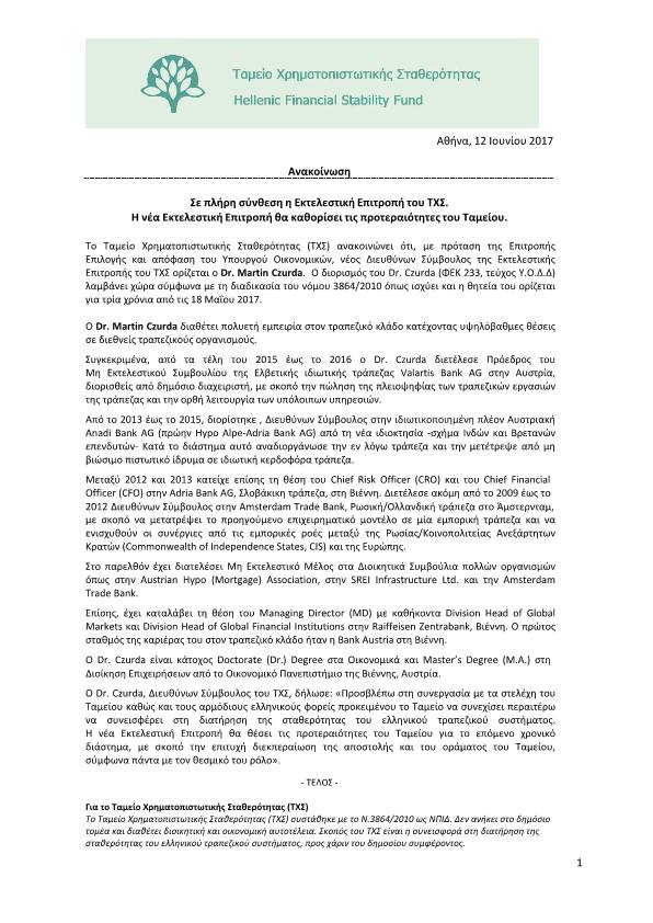 Με σχετικό δελτίο τύπου που εξέδωσε το ΤΧΣ μας ενημερώνει κατόπιν αποφάσεως του αρμοδίου υπουργού οικονομικών για τον διορισμό του νέου διευθύνοντα συμβούλου του εν λόγω ταμείου όπου σε αυτή την θέση αναλαμβάνει ο Αυστριακής καταγωγής κύριος Martin Czurda ο οποίος σύμφωνα πάντα με το σχετικό δελτίο έχει εμπειρία πάνω στην διεθνή τραπεζική μια και διετέλεσε στέλεχος πολλών Ευρωπαϊκών τραπεζών.