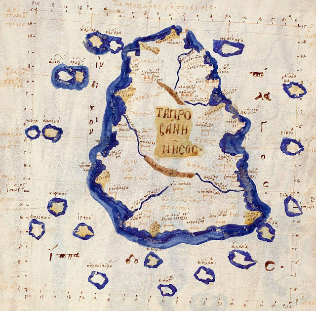 Ο 12ος ασιατικός χάρτης από μια ελληνική έκδοση χειρόγραφου της«Γεωγραφίας» του Κλαύδιου Πτολεμαίου, απεικονίζει την νήσοΤαπροβανή, όπως έλεγαν οι Έλληνες την Κεϋλάνη ή Σρι Λάνκα, νήσο στα ΝΑ. της Ινδίας.