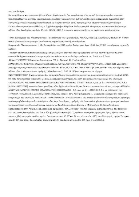 Για όσους επισκέφτηκαν το μεσημέρι στις 16:00 ώρα Ελλάδος το Ειρηνοδικείο Αθηνών θα είδαν τον συμβολαιογράφο Αθηνών να βγάζει σε πλειστηριασμό ακίνητο της εταιρείας ιδιοκτησίας της κυρίας Χαραλάμπους..Επισπεύδων η τράπεζα Πειραιώς…Αλλωστε οι ηλεκτρονικοί πλειστηριασμοί που αναρτώνται δημόσια μας αποκαλύπτουν περί του λόγου το αληθές και δεν είναι προσωπικό δεδομένο κυρία χαραλάμπους έτσι δεν είναι;;;