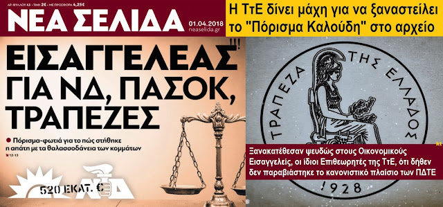 Να αναιρέσουν οι δύο Επιθεωρητές της ΤτΕ τις προηγούμενες καταθέσεις τους και να ομολογήσουν ότι την πρώτη φορά ψευδομαρτύρησαν ;;; Μήπως να του ομολογήσουν και ποιος ή ποιοι τους έβαλαν να ψευδομαρτυρήσουν την πρώτη φορά ;;; Ή μήπως περιμένει, οι υπάλληλοι της ΤτΕ, δια των καταθέσεών τους, να ομολογήσουν τις επί μια ολόκληρη δεκαετία (10 χρόνια !!!) εγκληματικές αμέλειες (για να μην το πω χειρότερα, όπως δλδ είναι στην πραγματικότητα), των ιδίων και των συναδέλφων τους, ως προς την άσκηση της προσήκουσας προληπτικής εποπτείας στις τράπεζες που, ενσυνείδητα, με γνώση και πρόθεση, δλδ με προφανή ΔΟΛΟ, μοίραζαν αφειδώς 100δες εκατομμύρια στο ΠΑΣΟΚ και τη ΝΔ, αποδεχόμενες ως εξασφαλίσεις τις ίδιες εκχωρήσεις των αβέβαιων μελλοντικών κρατικών χρηματοδοτήσεων του προϋπολογισμού, ακόμη και 5 φορές ;;;