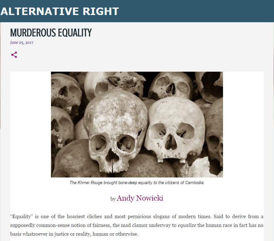 Η κληρονομιά της γενοκτονίας, της τρομοκρατίας και της τυραννίας που προκάλεσε η ώθηση για «ισότητα» δεν έχει καμία απολύτως διαφορά. Στην Ευρώπη και τη Βόρεια Αμερική, η επιθυμία να επιβληθεί η «ισότητα» έχει όλο και πιο έντονο αντι-λευκό υπόβαθρο. Οι υποστηρικτές της έχοντας ρουφήξει τον δηλητηριώδη πολιτιστικό μαρξισμό, όπως το γάλα της μητέρας τους, κολακεύουν τους εαυτούς τους ως «κοινωνικούς επαναστάτες», βλακωδώς αντιμετωπίζουν με έναν «ρομαντισμό» την κουλτούρα των μαύρων, των ισπανόφωνων, των μουσουλμάνων και οποιασδήποτε άλλης εθνοτικής μειονότητας, ενώ βλέπουν τους φυλετικούς τους αδελφούς που δεν τους ακολουθούν στις ιδεοληψίες τους, με μια αχαλίνωτη εχθρότητα.