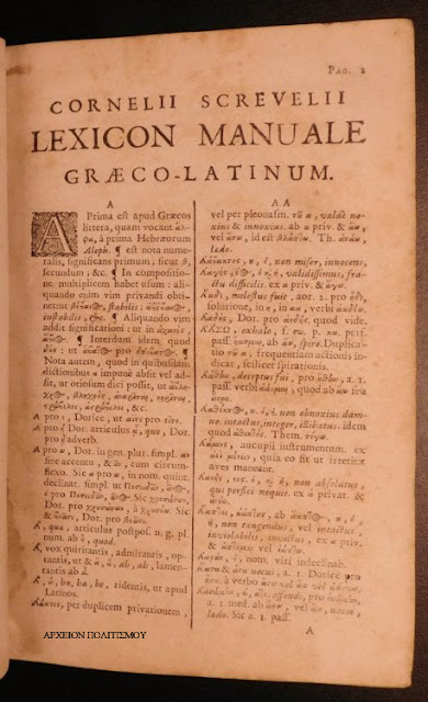 Αυτό το ελληνικό-λατινικό λεξικό, σχεδιάσθηκε για να βοηθήσει στην γραμματική και τις μεταφράσεις από τα λατινικά στα ελληνικά και το αντίστροφο. Το λεξικό του κυκλοφόρησε σε πολλές εκδόσεις, σε 6 γλώσσες, έως στις αρχές του 19ουαιώνα. Το 1826, το «Ελληνικό λεξικό του Schrevelius» εκδόθηκε στην Βοστόνη των ΗΠΑ, και έγινε το πρώτο ελληνικό λεξικό που χρησιμοποιήθηκε σε αμερικανικά σχολεία. Η συγκεκριμένη έκδοση που σας παρουσιάζω είναι του 1705, δεν υπάρχει στον κατάλογο του R. Wolf, και εκδόθηκε από τον Mercier στην Lutetia, στην πόλη των Παρισίων (Lutetiae Parisiorum: Ex officina P. A. Le Mercier). Έχει τίτλο «Corn. Schrevelii Lexicon manuale graeco-latinum et latino-graecum, utrumque hac quinta editione multo auctius … Ad calcem adjecta sunt Sententiae graeco-latinae, quibus omnia primitiva graeca comprehenduntur, item tractatus duo», και έχει συμβάλλει και ο Χιώτης Κωνσταντίνος Ροδοκανάκης (Constantini Rhodocanacidis Chiensis).