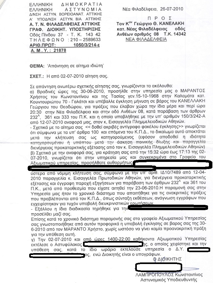 2-7-2010 ημέρα Παρασκευή όταν κλητεύτηκα από το Α/Τ Ν. Φιλ/φειας για να παραδώσω κατάθεση για μήνυση που για πολλοστή φορά μου είχε είχε καταθέσει ο Χρήστος Μάραντος, οικονομικός διευθυντής της Attica bank και μεταγενέστερα Γενικός διευθυντής οικονομικών υπηρεσιών της Attica bank.