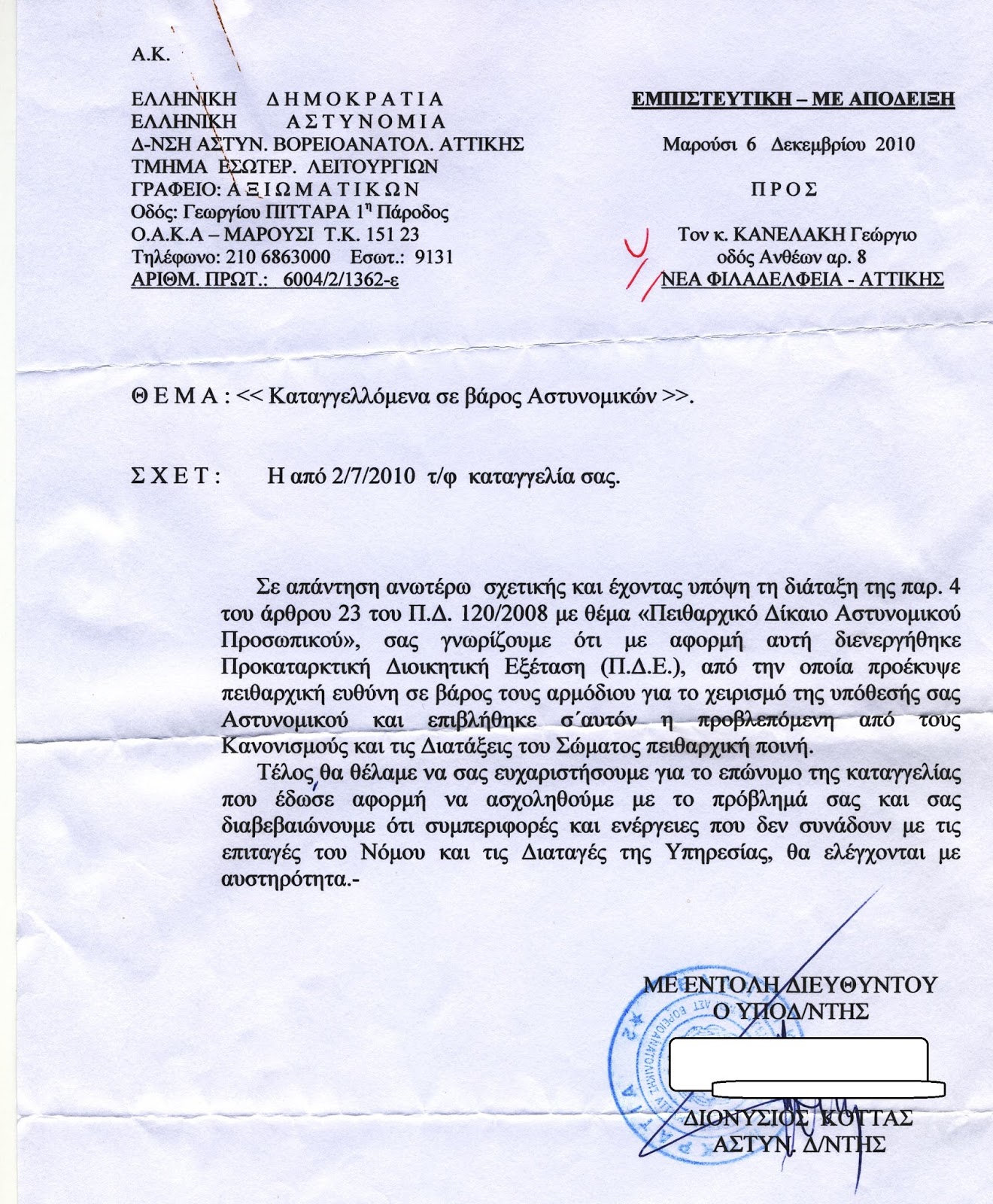 Έχοντας κατ΄ επανάληψη αποδείξει στη ζωή μου πως δεν είμαι ιδιώτης, αλλά Πολίτης και αρνούμενος την “ιδιότητα” που μου προσήψε ο τότε αστυνομικός διευθυντής στην επιστολή του (βλ. στην κορυφή το : “απάντηση σε ιδιώτη”), αναζήτησα και αποτάνθηκα στο Τμήμα Εσωτερικών Υποθέσεων της ΕΛ.ΑΣ.
