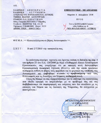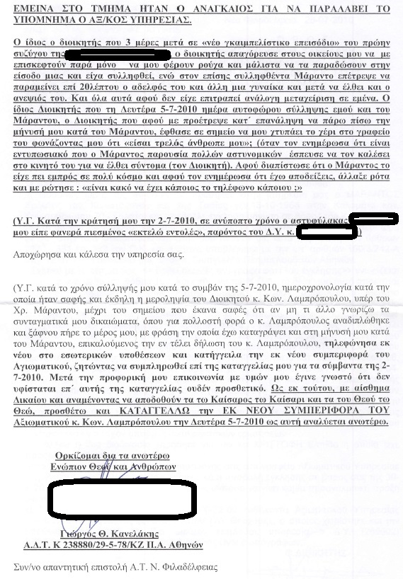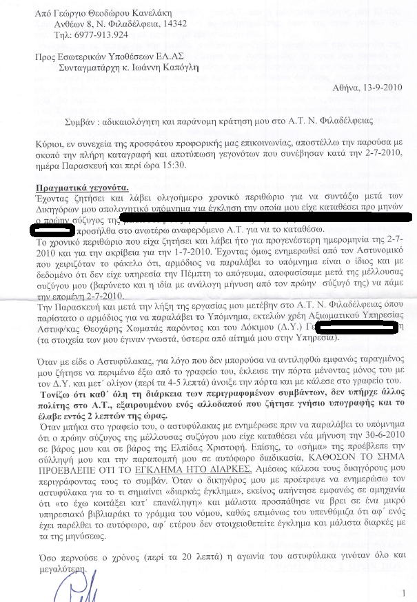 Ακολούθησα δηλαδή τις οδηγίες με τις οποίες με είχε συμβουλεύσει η διοίκηση των Εσωτερικών Υποθέσεων της ΕΛ.ΑΣ, ΑΛΛΑ που δεν έγινε αποδεκτό από τον συνταγματάρχη Καπόγλη και έτσι αναγκάστηκα να πάω (όπως μου ζήτησε) για να δώσω ΕΚΕΙ, στο κτίριο της ΕΛ.ΑΣ. στην Ν. Ιωνία, κατάθεση.