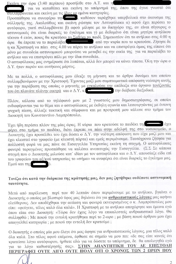Αξιοσημείωτο είναι το γεγονός πως ενόσω η επίσης “κατ’ αναγγελία συλληφθείσα” συμπαρισταμένη μου ζήτησε να φροντίσει έστω για την παραλαβή του ανήλικου από κάποιο οικείο της πρόσωπο, η Υπηρεσία, δια μέσω του Αρχιφύλακα, αρνήθηκε. Αφού έκανε τηλέφωνο πιο πριν (όπως μας είπε) στον Διοικητή του Α/Τ Ν. Φιλαδέλφειας Κωνσταντίνο Λαμπρόπουλο. Τελικά το ανήλικο το έφερε γειτόνισσα που το κρατούσε, στο Α/Τ για να είναι με την μητέρα του αφού η γειτόνισσα αδυνατούσε να το κρατήσει άλλο …