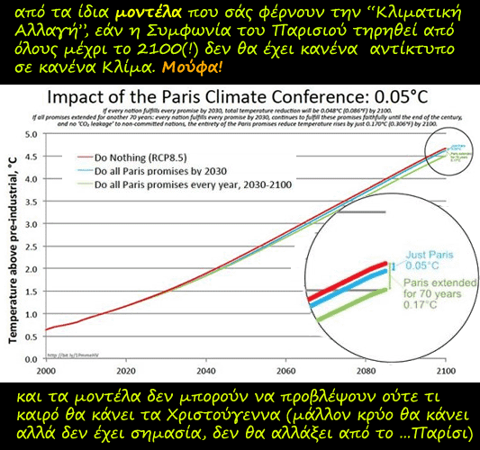 Εγώ προτιμώ την Πυθία. Η Πυθία λέει (με τα δικά της μοντέλα) ότι η όποια εφαρμογή του τέως Συμφώνου του Παρισιού δεν θα κάνει οποιαδήποτε διαφορά στο Κλίμα…