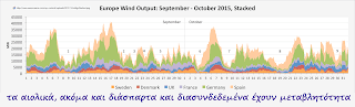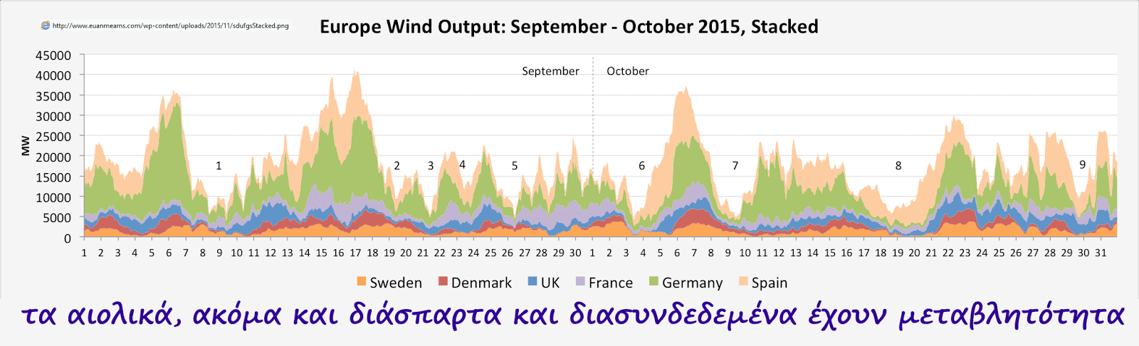 [1] Ο αέρας και ο ήλιος είναι “διαλείπουσες” (intermittent) μορφές ενέργειας. Δεν φυσάει συνέχεια και σταθερά. Ούτε έχει συνέχεια ήλιο. Συχνά, η “διαλείπουσα” λειτουργία ερμηνεύεται και σαν “μεταβλητή” λειτουργία με κύριο χαρακτηριστικό ότι η “μεταβλητότητα” δεν ελέγχεται από εμάς ή από μεταβολές στην ζήτηση και, πιο σημαντικό, η ενέργεια αυτή δεν είναι “κατανεμόμενη” (dispatchable), δηλαδή δεν μπορούμε εμείς να την αυξήσουμε ή να την μειώσουμε ανάλογα με αλλαγές στην ζήτηση και, πρέπει να μην ξεχνάμε, ότι σε ένα δίκτυο, η προσφορά πρέπει, αναγκαστικά, να είναι πάντα ίση με την ζήτηση.Εκτός από την “διαλείπουσα” και την “κατανεμόμενη” ή μη λειτουργία, ο ρυθμός και η προβλεψιμότητα της μεταβλητότητας είναι σημαντικός για την αναγκαστική εξισορρόπηση προσφοράς και ζήτησης: Μία ήπια και προβλέψιμη μεταβλητότητα είναι πιο εύκολα διαχειρίσιμη από μια απρόβλεπτη και απότομη μεταβλητότητα. Και όπως δείχνει η εικόνα (από εδώ), από όλα τα αιολικά της Ευρώπης, όταν φυσάει ή δεν φυσάει, είναι πανευρωπαϊκό φαινόμενο. Η διαλείπουσα λειτουργία δεν χάνεται με πολλά και διασυνδεδεμένα αιολικά.