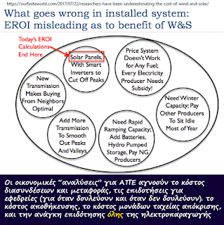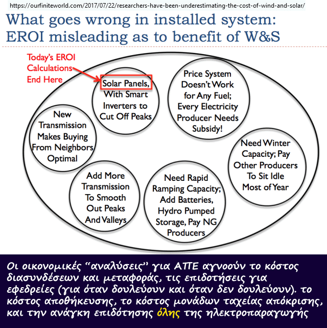 Το δεύτερο εξαιρετικό άρθρο εστιάζεται και αυτό στο κόστος και τις αρνητικές συνέπειες πολλών ΑΠΕ σε ένα δίκτυο, και πώς υποεκτιμάται το κόστος των ΑΠΕ με τους συνήθεις τρόπους που παρουσιάζεται. Αναφέρει ότι πέρα από το ανεπαρκές και παραπλανητικό LCOE, ένας τρόπος εκτίμησης της “συμβολής” των ΑΠΕ, το “EROI” (Energy Returned on Energy Invested, Απόδοση Ενέργειας από την Επενδυμένη Ενέργεια) είναι επίσης ανεπαρκής, και ότι, ακόμα και σε μικρά ποσοστά διείσδυσης ΑΠΕ, η διαλείπουσα λειτουργία τους διαστρεβλώνει τόσο την κοστολογική ανάλυση και τις τιμές, όσο και την υποτιθέμενη εξοικονόμηση CO2 (δηλαδή καύσιμου).