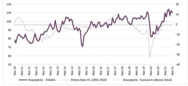 Yποχώρηση σημείωσε ο δείκτης επιχειρηματικών προσδοκιών στη βιομηχανία τον Νοέμβριο, ο οποίος διαμορφώθηκε σε 110,2 μονάδες έναντι 112,9 μονάδων του Οκτωβρίου, ωστόσο, παραμένει αισθητά υψηλότερος σε σύγκριση με τον Νιέμβριο του 2020 (89,2 μονάδες).
