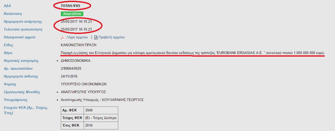 Με έκπληξη όμως είδαμε πως αυτή η πράξη δημοσιεύθηκε στο διαύγεια στις 25/5/2017 δηλαδή 6 μήνες μετά..Προφανώς δεν το πράξανε γιατί θέλανε να κρύψουν τις αποφάσεις τους οι οποίες δεσμεύουν την χώρα με εγγύηση ύψους δυο δις σε δύο τράπεζες οι οποίες έχουν περάσει πλέον στα χέρια ιδιωτών ξένων επενδυτών..