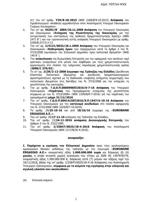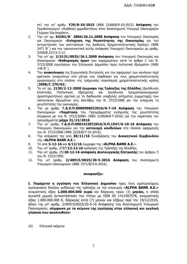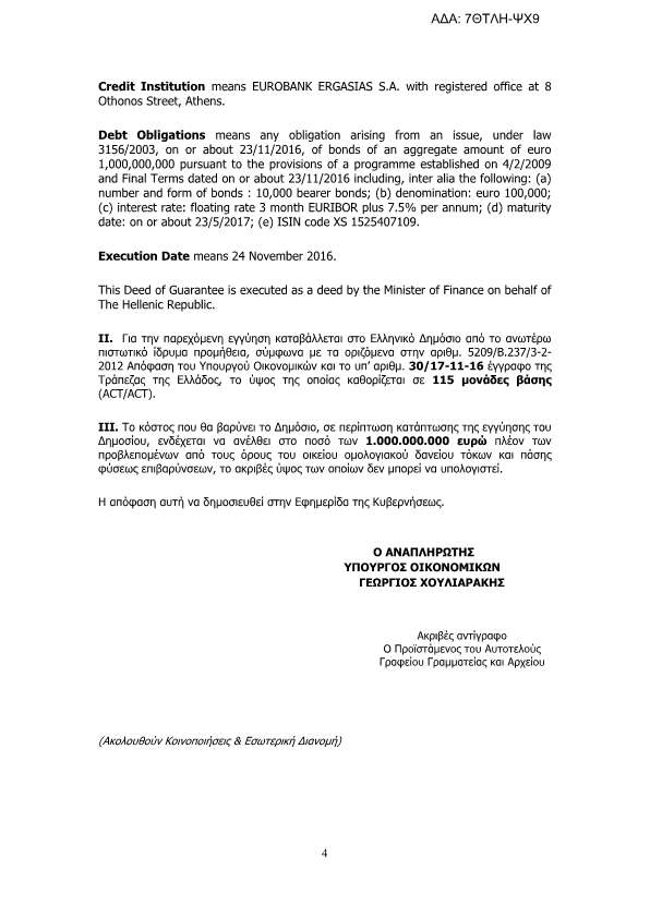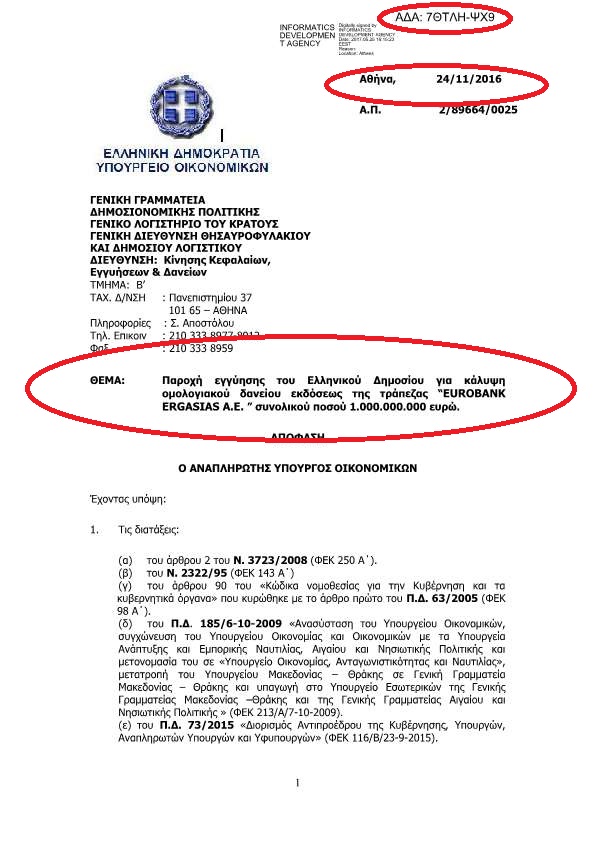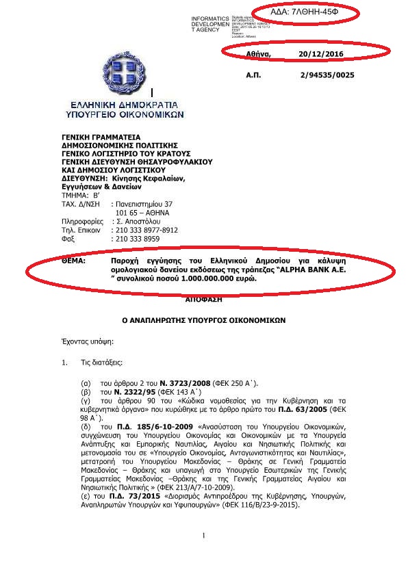 Με εντολή Χουλιαράκη το Ελληνικό δημόσιο προ 6μήνου εγγυήθηκε για την έκδοση ομολογιακών δανείων υπέρ των τραπεζών eurobank και alpha bank ύψους 1 δις για την κάθε μία..