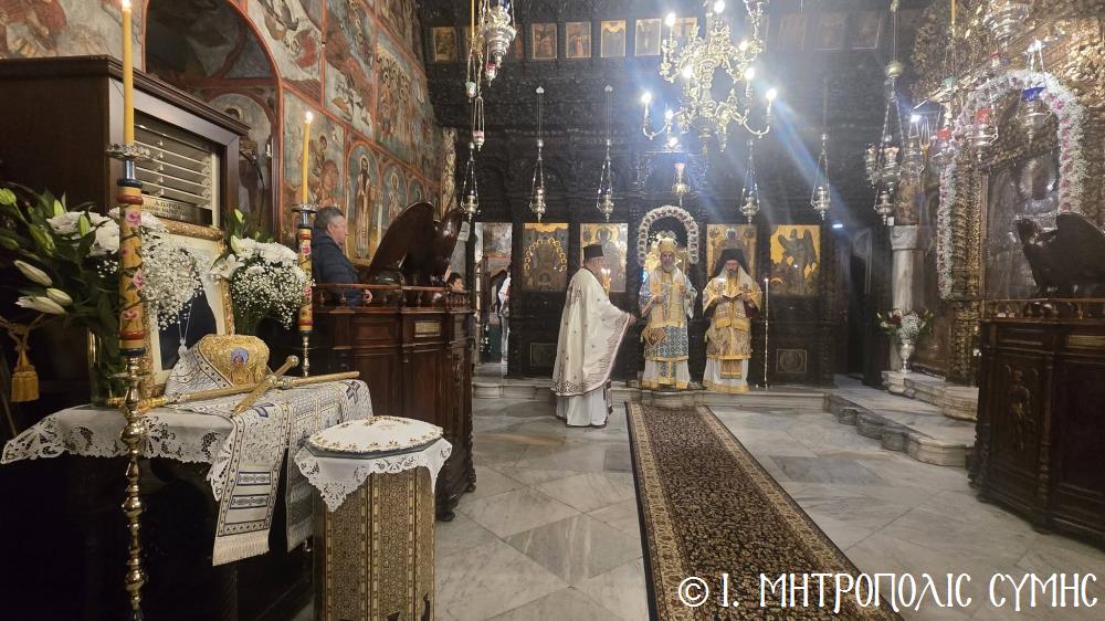 Ὁ Σεβ. Ποιμενάρχης μας κ. Χρυσόστομος, χοροστάτησε τοῦ Ὄρθρου, ἐτέλεσε τήν Θεία Λειτουργία καί ἐν συνεχείᾳ μετά τήν ἀπόλυση, προέστη τοῦ Ἱεροῦ Μνημοσύνου, πλαισιούμενος ὑπό τοῦ Θεοφιλ. Βοηθοῦ Αὐτοῦ Ἐπισκόπου Ροδοστόλου κ. Ἀντωνίου, Καθηγουμένου τῆς Ἱ. Μονῆς, τοῦ Γεν. Ἀρχιερατικοῦ Ἐπιτρόπου, Πρωτοπρ. Στεφάνου Μακρῆ καί τῶν Διακόνων μας π. Παύλου Τερεζάκη καί π. Νικολάου Καρμανιώλου. Τήν ἱερά ὑμνωδία ἀπέδωσαν γλυκυφθόγγως οἱ Ἱεροψάλτες κ. Ἐλευθέριος Ξηράκης κ. κ. Δημοσθένης καί Μερκούριος Γιανναρᾶς καί κ. Εὐάγγελος Λαγός, ἐνῶ μεταξύ τοῦ πολυπληθοῦς ἐκκλησιάσματος συμμετεῖχαν, ὁ Δήμαρχος Σύμης κ. Ἐλευθέριος Παπακαλοδούκας καί ὁ Στρατιωτικός Διοικητής Δ.Α.Ν. Σύμης Συνταγματάρχης κ. Χαράλαμπος Κατηφόρης.