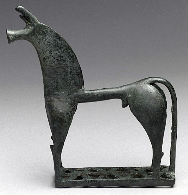 Αυτό το μικρό χάλκινο άλογο παρουσιάζει όλα τα χαρακτηριστικά του αφηρημένου στυλ της Γεωμετρικής περιόδου. Στέκεται με ένα επιμηκυμένο σώμα, επάνω σε ένα ζευγάρι λεπτών ποδιών, με ισορροπεί μια ελικοειδή ουρά, η οποία δεν φτάνει μέχρι το έδαφος για καλύτερη ισορροπία από τον ικανότατο καλλιτέχνη! Η μινιμαλιστική κεφαλή φέρει αναπόσπαστη χαίτη, επίμηκες πρόσωπο με κυλινδρικό ρύγχος και ένα μοναδικό έντονο αυτί στην κορυφή!