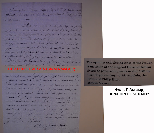 Για να δικαιολογήσουν την κατάπτυστη κλοπή-λεηλασία-ιεροσυλία, για την οποία η Νέμεσις καραδοκεί, οι Άγγλοι εκθέτουν στο Βρετανικό Μουσείο τμήμα μιας δήθεν άδειας – ένα κείμενο στα… ιταλικά, το πρωτότυπο του οποίου δεν υπάρχει στα τουρκικά, και μάλιστα ακόμη και από αυτό…τεχνηέντως… παραλείπεται η… μεσαία παράγραφος, στην οποία αναφέρεται ότι… απαγορεύεται οποιαδήποτε βλάβη στο μνημείο[1].