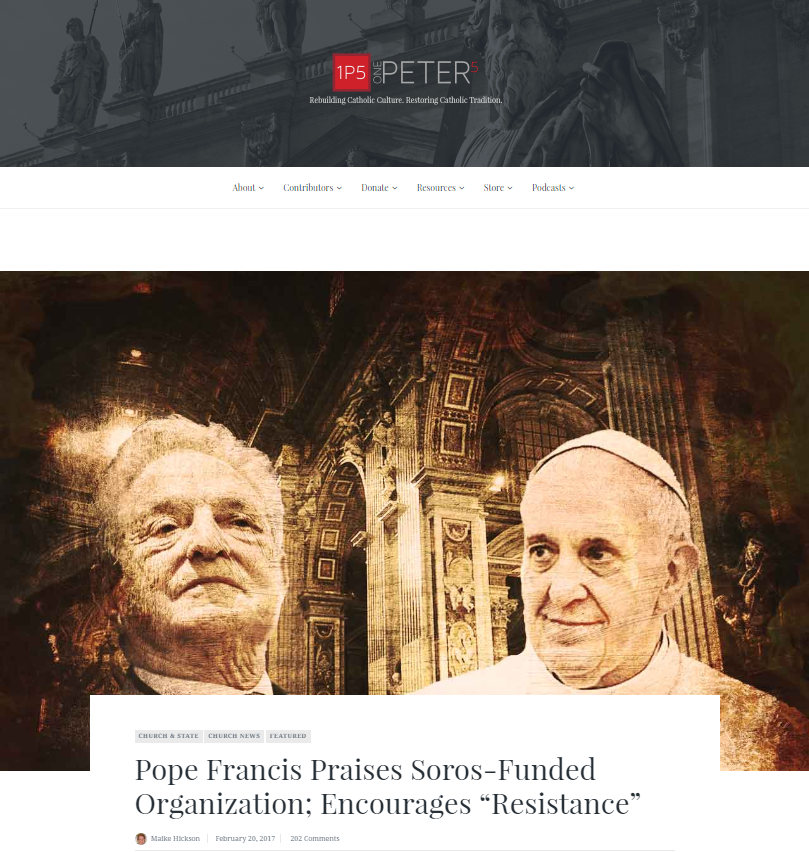 “Email που διέρρευσαν μέσω του WikiLeaks αποκαλύπτουν ότι ο δισεκατομμυριούχος της παγκοσμιοποίησης Τζορτζ Σόρος – ένας από τους κορυφαίους χορηγούς της Χίλαρι Κλίντον – κατέβαλλε 650.000 δολάρια για να επηρεάσει το ταξίδι του Πάπα Φραγκίσκου στις ΗΠΑ τον Σεπτέμβριο του 2015 με στόχο “την αλλαγή σε παραδείγματα και προτεραιότητες στην πορεία προς την προεδρική εκστρατεία”. Τα κεφάλαια αυτά διατέθηκαν τον Απρίλιο του 2015 και η έκθεση σχετικά με την αποτελεσματικότητά τους υποδηλώνει ότι τα επιτυχή της επιτεύγματα περιλαμβάνουν το “να πειστούν επιμέρους επίσκοποι να εκφράσουν πιο δημόσια την στήριξη σε μηνύματα για οικονομική και φυλετική δικαιοσύνη προκειμένου να αρχίσει να δημιουργείται μια κρίσιμη μάζα επισκόπων που θα ευθυγραμμίζονται με τον Πάπα. “[…]