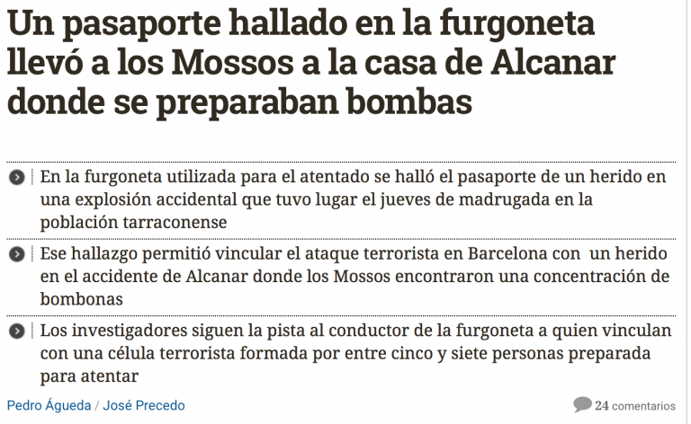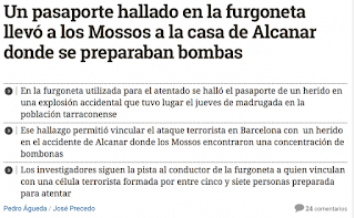 Το παρακάτω δημοσίευμα αναφέρει ότι το διαβατήριο που ανακαλύφθηκε στο βαν οδήγησε ”στο σπίτι στο Alcanar όπου παρασκευάζονταν βόμβες”. Σύμφωνα με ισχυρισμούς το διαβατήριο βρέθηκε στο βαν που χρησιμοποιήθηκε στην επίθεση σε ”μία κατά λάθος έκρηξη που έγινε την Πέμπτη το πρωί στη πόλη Tarraconence. Αυτό το εύρημα επέτρεψε την σύνδεση της τρομοκρατικής επίθεσης στην Βαρκελώνη με έναν τραυματία στο ατύχημα στο Alcanar.