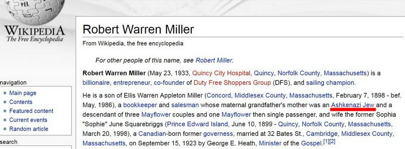 Σύμφωνα με την Βικιπαίδεια, ο Robert Warren Miller, που γεννήθηκε στις 23 Μαΐου 1933, ο πάμπλουτος συμπέθερος του «Έλληνα» τέως βασιλιά, είναι ΕΒΡΑΙΟΣ Ασκεναζίμ στην καταγωγή. Ενώ πιο «περιούσιος» δεν μπορεί να γίνει, τα τελευταία χρόνια καταβάλλονται ιδιαίτερες προσπάθειες να αποκρυφτεί αυτή η «ιδιαίτερη» καταγωγή. Στις νεώτερες εκδόσεις της Βικιπαίδειας, απαλείφθηκε η αναφορά στους Εβραίους Ασκεναζίμ.