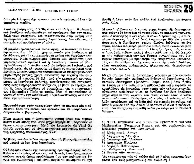 Στα «Τεχνικά Χρονικά» του Τ.Ε.Ε., το 1966 είχε δημοσιευτεί το παρακάτω σχετικό άρθρο, με τίτλο, «Κυβερνητική Μία Πανεπιστήμη;)».