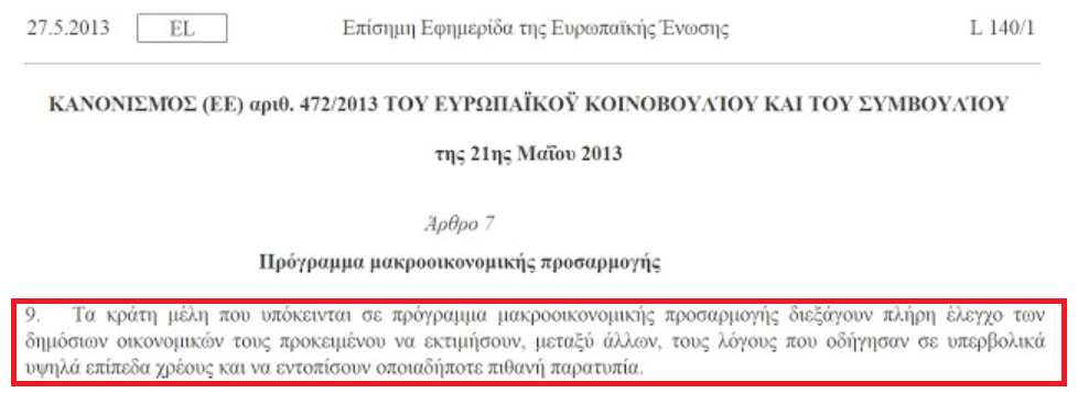 -H ΔΙΑΔΙΚΑΣΙΑ ΕΛΕΓΧΟΥ και δυνατότητας ΔΙΑΓΡΑΦΗΣ του Δημοσίου Χρέους για Κράτος -Μέλος της ΕΕ είναι μία και αναγνωρισμένη από το Ευρωπαϊκό Δίκαιο (βλ. Κανονισμός ΕΕ 472/2013).