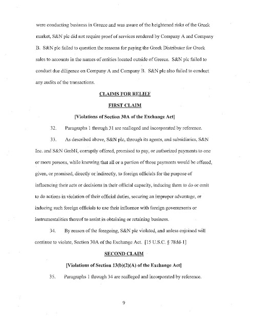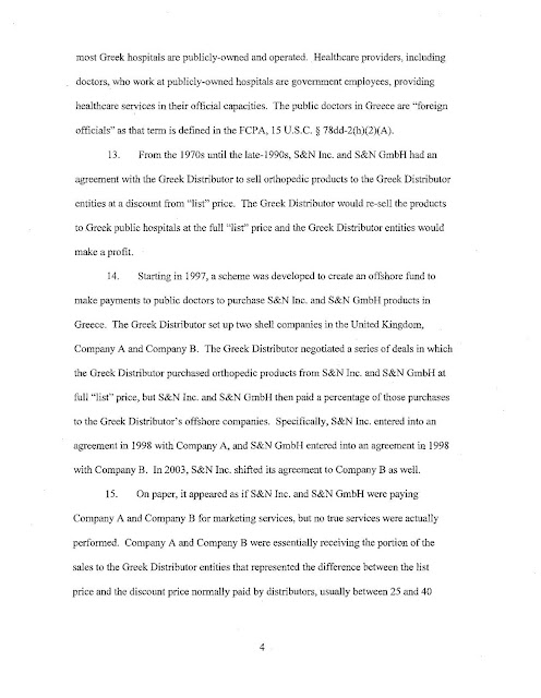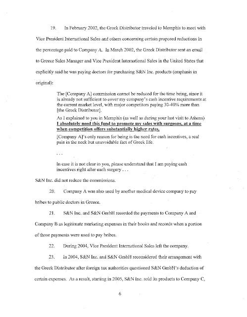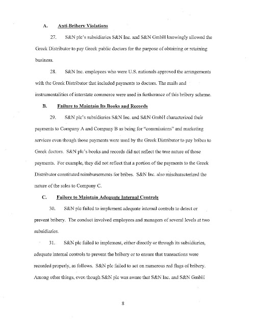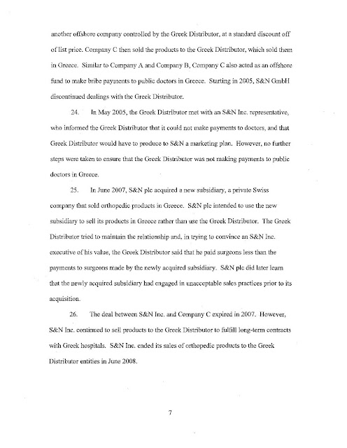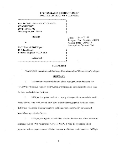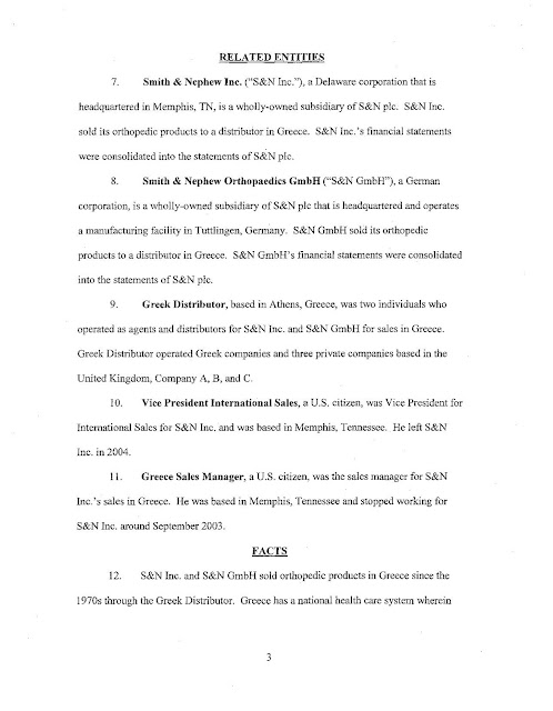 Η SEC ισχυρίζεται ότι δύο από τις θυγατρικές της Smith & Nephew PLC, συμπεριλαμβανομένης της αμερικανικής θυγατρικής της, Smith & Nephew Inc., από το 1997 έως τον Ιούνιο του 2008, χρησιμοποίησαν έναν διανομέα για να δημιουργήσουν ένα αχρησιμοποίητο ταμείο για να κάνουν παράνομες πληρωμές σε δημόσιους γιατρούς που απασχολούνται από κυβερνητικά νοσοκομεία ή φορείς στην Ελλάδα. Η Smith & Nephew PLC συμφώνησε να διακανονίσει τα τέλη της Επιτροπής Κεφαλαιαγοράς, πληρώνοντας περισσότερα από 5,4 εκατομμύρια δολάρια σε τόκους απογοήτευσης και προκατάληψης. Η θυγατρική της Smith & Nephew της PLC, Smith & Nephew Inc., συμφώνησε να καταβάλει πρόστιμο ύψους 16,8 εκατομμυρίων δολαρίων για την επίλυση παράλληλων ποινικών αγωγών που ανακοινώθηκαν σήμερα από το Υπουργείο Δικαιοσύνης των ΗΠΑ.