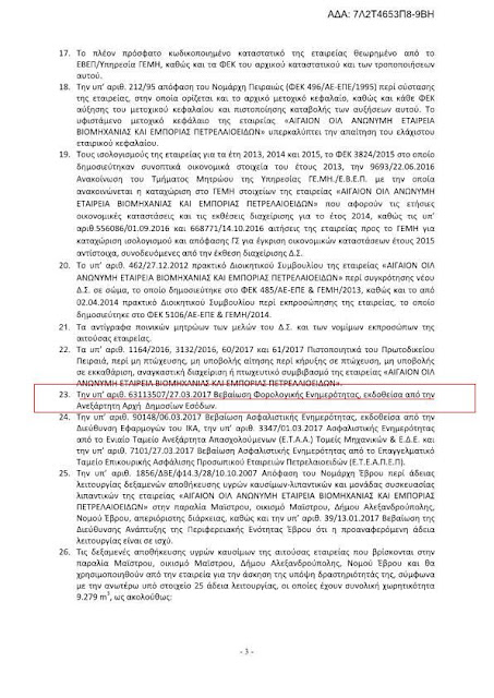 Πολιτική αλητεία δίχως τέλος από μια συμμορία που έχει παραδώσει την χώρα στους τραπεζίτες και συμβιβάστηκε στους εγχώριους νταβατζήδες..Με απόφαση του αρμοδίου υπουργού Περιβάλλοντος και ενέργειας κυρίου Σταθάκη και με ημερομηνία 6/4/2017 δόθηκε 5ετή άδεια λειτουργίας των δεξαμενών καυσίμων της εταιρείας συμφερόντων Μελισσανίδη ΑΙΓΑΙΟΝ ΟΙΛ στην περιοχή της Αλεξανδρούπολης, οι προϋποθέσεις αδειοδότησης σύμφωνα με τον νόμο προβλέπουν πως η εν λόγω εταιρεία πρέπει να προσκομίσει ασφαλιστική και φορολογική ενημερότητα.