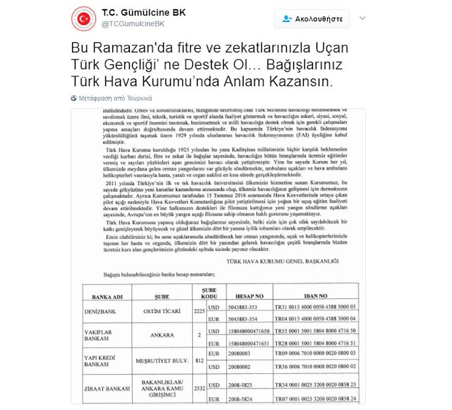 Στην ιστοσελίδα του στο Twitter το τουρκικό προξενείο έχει αναρτήσει επίσης και τους λογαριασμούς τραπεζών που θα καταθέσουν οι μουσουλμάνοι τις δωρεές τους.