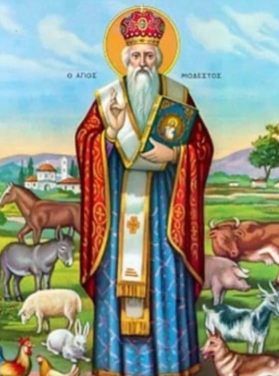 Του Κυρίου Δεηθώμεν. Ό του φωτός δημιουργός, Κύριε ο Θεός ημων, καταξίωσόν με της βασιλείας σου επιτυχειν, ότι σέ, Δέσποτα, καί μόνον επεπόθησεν η ψυχή μου, καί διά τό όνομά σου, θανάτου καί βασάνων ηυλόγησα:. μή ουν ανάξιον κρίνης μέ φιλάνθρωπε, των σων αγαθων, αλλ’ επάκουσόν μου του δούλου σου, καί πρόσδεξαί μου ταύτην τήν προσευχήν. καί όστις τό εμόν επικαλέσηται όνομα, καί τήν μνήμην εμου του ταπεινου εκτελέση, βοηθός αυτω γενου, Κύριε, καί μή εγκαταλίπης αυτόν, αλλ’ έμπλησον αυτόν παντός αγαθου, καί δώρησαι αυτω πλούσια τά ελέη σου. καί όστις αναγνώση τό της αθλήσεώς μου μαρτύριον, ευλόγησον αυτόν , Κύριε, καί πασαν τήν περιουσίαν αυτου. Απέλασον δέ καί αποδίωξον διά του ονόματος του δούλου σου Μοδέστου από πάντων αυτου των κτηνων παντοίαν βλάβην καί νόσον. Ναί, Δέσποτα, έπιδε εξ αγίου κατοικητηρίου σου, επί τήν εμήν προσευχήν, καί ευλόγησον, καί πλήθυνον τά κτήνη αυτου, ως ευλόγησας καί επλήθυνας τά ποίμνια, Αβραάμ, Ισαάκ καί Ιακώβ, καί πάντων σου των θεραπόντων, ότι ευλογητός ει εις τούς αιωνας των αιώνων. Αμήν.