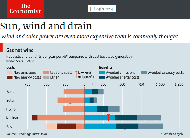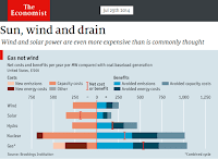 1) Η ηλιακή ενέργεια, ακόμα και δωρεάν (συμβόλαια από προμηθευτή με χαμηλές τιμές), ελλείψει φθηνής και απρόσκοπτης αποθήκευσης, δεν μπορεί να είναι ποτέ φθηνότερη από (ή να υποκαταστήσει) οποιαδήποτε κατανεμόμενη πηγή ενέργειας: α) το μεταβλητό κόστος δεν είναι “συνολικό” κόστος, β) το μεσοσταθμισμένο κόστος (LCOE) δεν είναι το μεσοσταθισμένο κόστος υποκατάστασης (LACE). Την διαφορά την έχει επισημάνει το Αμερικανικό DOE, Υπουργείο Ενέργειας, και το LACE είναι το ενδεδειγμένο όπως πολύ απλά ανέπτυξε ο Economist. Το ρεύμα 9:00-18:00 μπορεί να είναι δωρεάν, αλλά είναι δώρον άδωρον στις 21:00 το βράδυ ή στις 6:00 το πρωί. Θα τα εξηγήσω άλλη μια φορά στην καημένη την Μάχη, αλλά όχι τώρα.