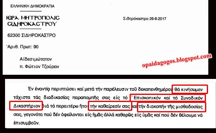 Πως τολματε και δικαζετε με έναν νομο που ο ιδιος ο επισκοπος είναι ο διωκτης, ο ιδιος ο κατηγορος, ο ιδιος είναι ο εισαγγελεας, ο ιδιος είναι ο δικαστης, ο ιδιος διοριζει τους συνδικαστες υφισταμενους της προτιμησεως του και ο ιδιος βγαζει τις αποφασεις και καταδικαζει τον κατηγορουμενο κληρικο; Ποιος θα ακουση αυτά τα εξωφρενικα και αδιανοητα που εφαρμοζετε με τον νομο 5383/1932 και δεν θα εκραγη από θυμο και αγανακτησι;
