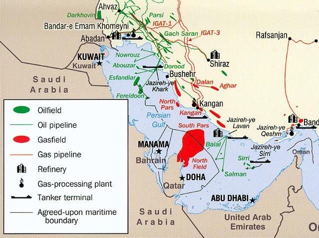 Παράλληλα το Κατάρ είχε ακόμα περισσότερους λόγους να φοβάται το Ιράν εφόσον όχι μόνο συνορεύει με αυτό στον Περσικό κόλπο αλλά μοιράζεται και τα ίδια υποθαλάσσια κοιτάσματα αερίου με το Ιράν.(εικόνα κάτω)
