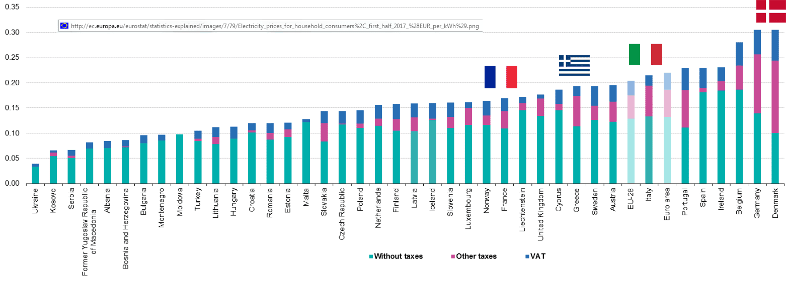 Η τιμή του οικιακού ρεύματος, στην Ιταλία, είναι στον μέσον όρο της Ευρώπης, πιο φθυηνό από τους “γίγαντες” Δανία και Γερμανία, και πιο ακριβό από το δικό μας. Οι χώρες με πολλές ΑΠΕ έχουν το ακριβότερο ρεύμα και οι χώρες με πυρηνικά και κάρβουνο το φθηνότερο: