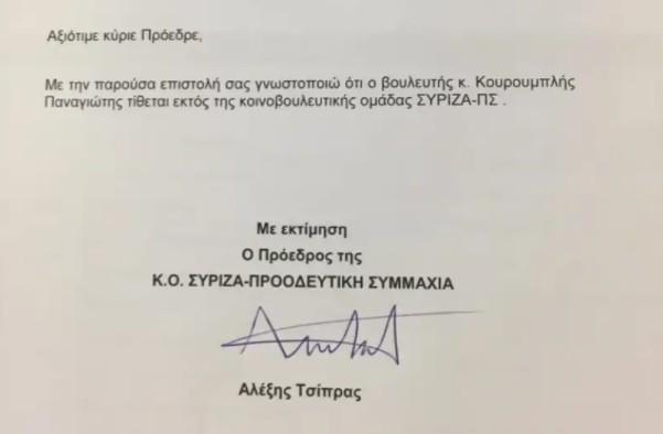 Εκτός κοινοβουλευτικής ομάδας έθεσε ο ΣΥΡΙΖΑ τον βουλευτή Παναγιώτη Κουρουμπλή. Με απόφαση του προέδρου του κόμματος Αλέξη Τσίπρα, ο βουλευτής διαγράφεται. Είχαν προηγηθεί οι ακραίες αιτιάσεις του από το βήμα της Βουλής περί «δολοφονιών».