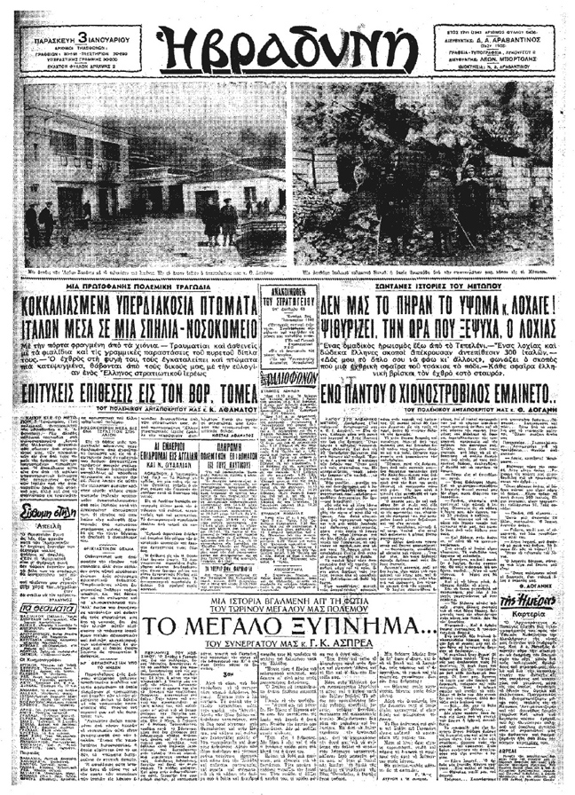 Ακολουθούν διάφορα πρωτοσέλιδα της εφημερίδας «Βραδυνή» από την εποχή του ελληνοϊταλικού πολέμου