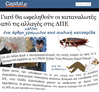 Και εμείς απασχολούμε άτομα, χωματουργούς, μεσάζοντες, λομπίστες και παπαγάλους. Για τους οποίους το πάνω είναι κάτω, το άσπρο μαύρο και το ΕΤΜΕΑΡ (όπως βαφτίστηκε το τέλος υπέρ ΑΠΕ) το βούτυρο στο ψωμάκι τους και το χαρτζιλίκι για τους χωματουργούς που έγιναν αεριάδες και τώρα ηλεκτροπαραγωγοί.
