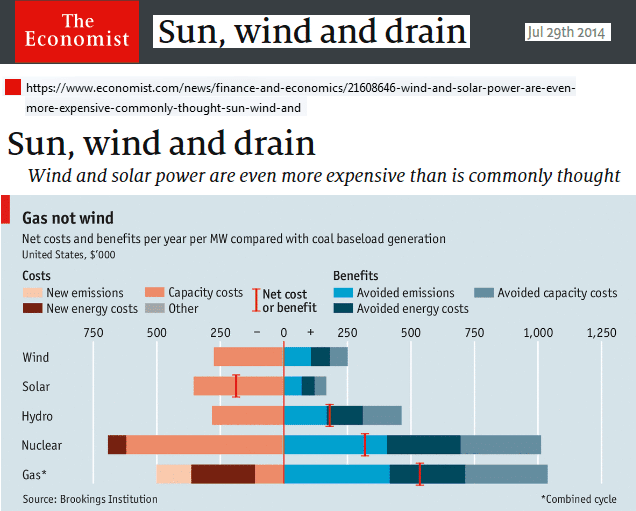 Ο Economist μετέφερε την άποψη ότι το μεσοσταθμισμένο κόστος LCOE αγνοεί το κόστος των εφεδρειών και της ενσωμάτωσης της διαλείπουσας λειτουργίας στα δίκτυα. Δείχνει ότι τα αιολικά και τα φ/β υποκαθιστούν πολύ μικρότερο κόστος συμβατική ισχύ από το δικό τους και καταλήγει στο ίδιο περίπου συμπέρασμα στα οποία κατέληξε, από άλλη σκοπιά, και το άρθρο στην σελίδα της Energiewende, στην προηγούμενη ανάρτηση: Τα (υποχρεωτικά) αιολικά είναι οριακά και τα φ/β δεν συμφέρουν.