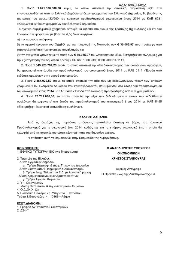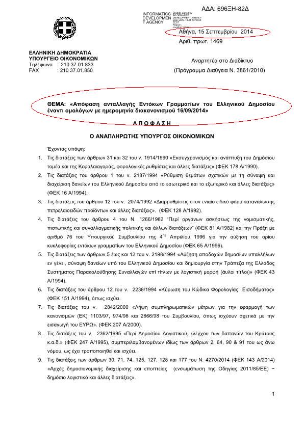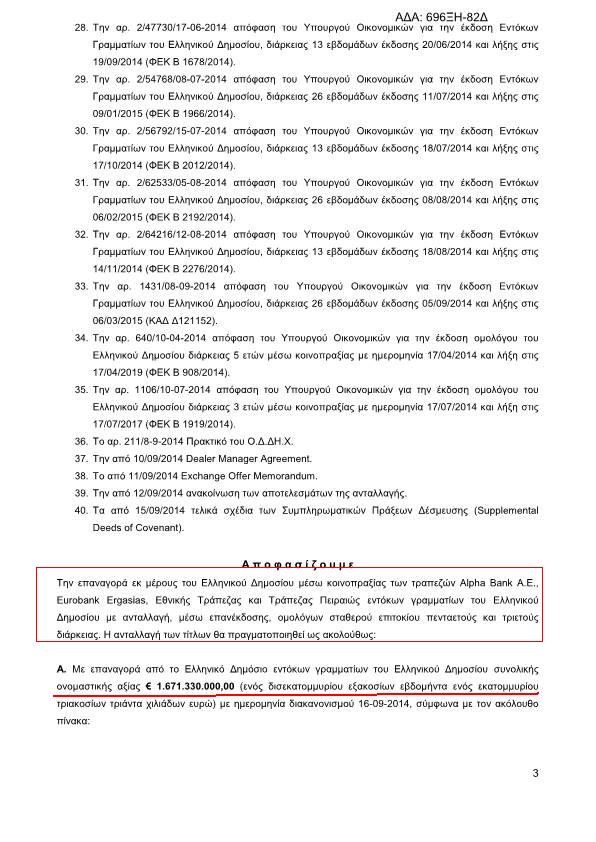 Ο τότε αναπληρωτής υπουργός κύριος Σταϊκούρας αντάλλαξε τα εν λόγω ΕΓΕΔ με ομόλογα τριετούς και πενταετούς διάρκειας σύμφωνα με την εν λόγω απόφαση..