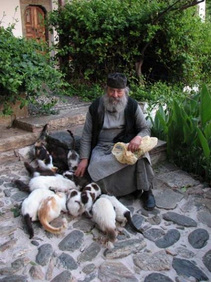 (είναι από τους ελάχιστους γέροντες του Αγίου Όρους του οποίου τα χέρια είναι ροζιασμένα από τους μώλωπες και τον ξυλοκασμά με τον οποίο καθαρίζει ελιές και επισκευάζει το μοναστήρι του εδώ και χρόνια).
