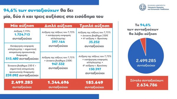 – Συνολικά, το 94,6% των συνταξιούχων θα δουν μια, δυο ή και τρεις αυξήσεις στις αποδοχές τους.