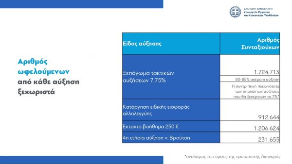 1) Από την οριζόντια αύξηση του 7,75% θα ωφεληθούν 1.724.713 συνταξιούχοι.