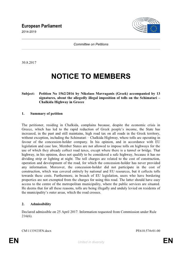 Η εν λόγω αναφορά έγινε αποδεκτή και έφτασε στην ολομέλεια της ΕΕ στις 30/8/2017 και το απίστευτο αυτής της ιστορίας είναι πως ο καταγγέλων σήμερα είναι αρμόδιος υφυπουργός υποδομών και μαζί με τον Σπίρτζη και την κυβέρνηση ΣΥΡΙΖΑ υπογράφει την εγκατάσταση διοδίων σε όλη την χώρα..