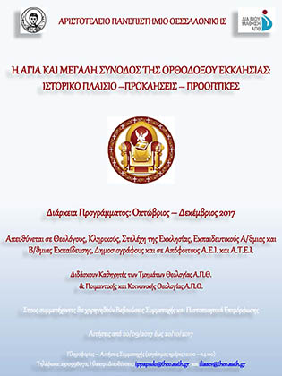Το Πρόγραμμα Επιμόρφωσης της Δομής Δια Βίου Μάθησης Α.Π.Θ. «Η Αγία και Μεγάλη Σύνοδος της Ορθοδόξου Εκκλησίας: Ιστορικό πλαίσιο – Προκλήσεις – Προοπτικές» θα πραγματοποιηθεί κατά το χειμερινό εξάμηνο του ακαδημαϊκού έτους 2017-2018.