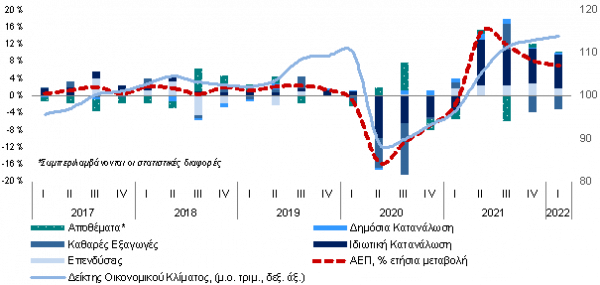 Σύμφωνα με την πρόσφατη ανακοίνωση της ΕΛΣΤΑΤ, η ανάκαμψη της οικονομικής δραστηριότητας το πρώτο τρίμηνο του 2022 στην Ελλάδα ήταν ισχυρή, καθώς το πραγματικό ΑΕΠ αυξήθηκε κατά 7% σε ετήσια βάση και προήλθε από την ενίσχυση πρωτίστως της ιδιωτικής κατανάλωσης και δευτερευόντως των επενδύσεων. Αντίθετα, ο εξωτερικός τομέας συνέβαλε αρνητικά, καθώς η αξία των εισαγωγών επιβαρύνθηκε από τις αυξημένες τιμές της ενέργειας σε σχέση με πέρυσι.