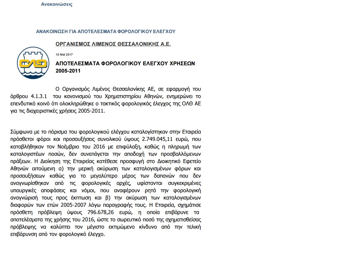 Με σχετικό δελτίο τύπου που εξέδωσε ο Οργανισμός Λιμένος Θεσσαλονίκης προς το επενδυτικό κοινό μας ενημερώνει πως οι φορολογικοί έλεγχοι που γίνανε στην εν λόγω εταιρεία, καταλογίστηκαν πρόσθετοι φόροι για τις διαχειριστικές χρήσεις 2005-2011 ύψους 2.749.045 ευρώ και πως η διοίκηση του ΟΛΘ προσέφυγε στο διοικητικό εφετείο προκειμένου να ακυρωθούν οι εν λόγω προσαυξήσεις.