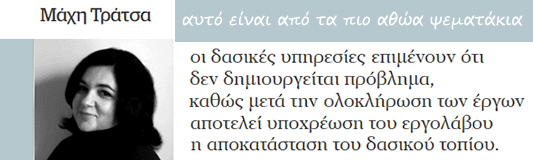 Αφού η Δασική Υπηρεσία επιμένει ότι όλα γίνονται με τις οδηγίες της και ότι ο εργολάβος θα αποκαταστήσει το …τοπίο, έτσι θα είναι. Σχεδόν καθημερινά η Δασική Υπηρεσία βάζει τα δύο πόδια των κκ. Κ, Μ, Κ και Π σε ένα παπούτσι. Όλη η Εύβοια και όλη η κοντινή Πάρνηθα και τα φρεσκοκαμμένα Δερβενοχώρια είναι απόδειξη ότι η Δασική προστατεύει τα δάση και ότι ελέγχει σαν Κέρβερος τους εργολάβους.